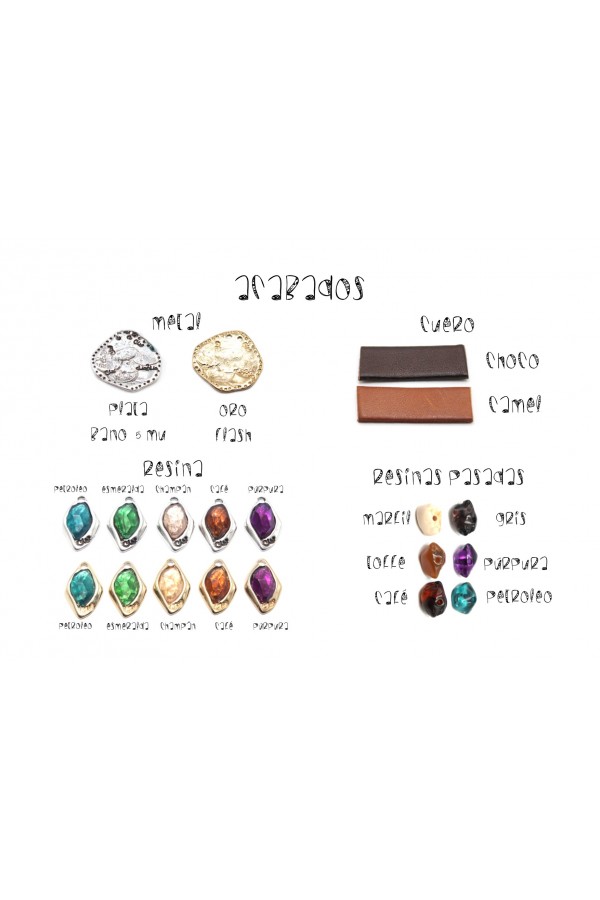 Zamak / Peltre baño plata 5µ / Perlas nácar / Cuero y piel nacionales / Resinas epoxi / Cristal checo