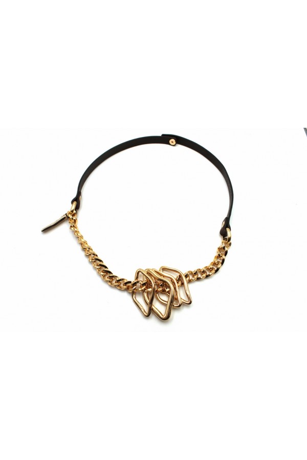 Gargantilla mixta cuero plano-cadena trabada de 45 cms. Chapado oro 24k.