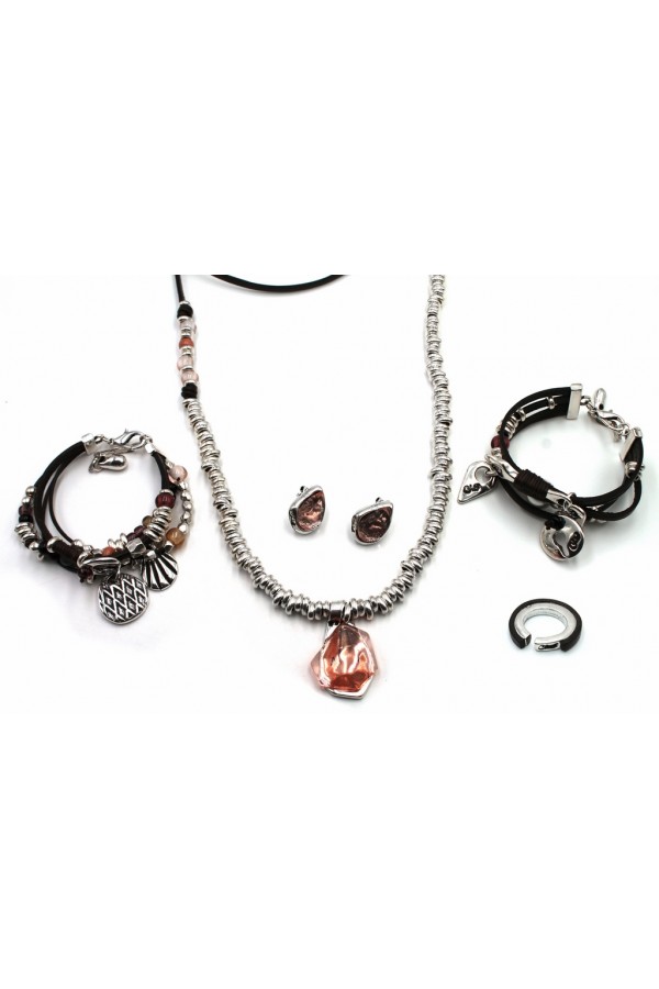 Zamak / Peltre baño plata 5µ / Perlas nácar / Cuero y piel nacionales / Resinas epoxi / Cristal checo